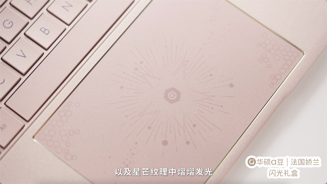 为颂扬新一代蓬勃美学生命力,华硕a豆与法国娇兰在“光之美学”的框架下相遇,将视觉艺术转化为嗅觉诗篇。机身A面加入独创香片匣,以馥郁香氛疗愈情绪,助你尽情享受被光与香氛宠溺的美好瞬间,采用全新「蜂巢绮光」设计,以六角蜂巢为视觉焦点,蜂胶晶莹缀于边缘,光芒图案如晨曦绽放,与adol logo花瓣旋舞交融,诠释“为美而生”的极致境界,尽显品质生活美学。