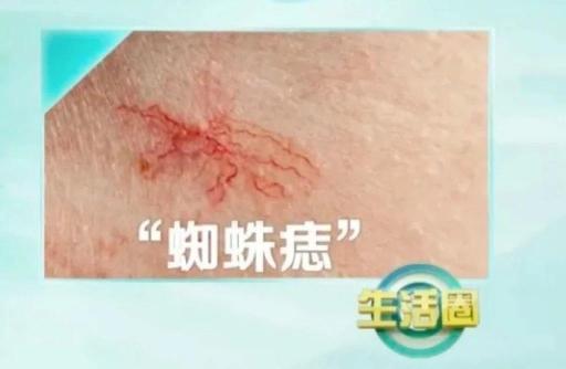 “蜘蛛痣”是一种细小的血管扩张,看起来像红色或紫色的蜘蛛网状图案,常见于面、颈和上胸部,这可能是肝脏疾病导致雌激素水平升高的结果。