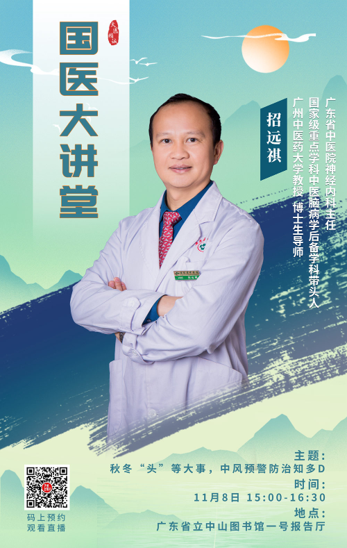 招远祺教授是国家级重点学科中医脑病学科的后备学科带头人,同时担任广州中医药大学教授、博士生导师,在神经内科领域具有深厚的学术造诣和丰富的临床经验。届时,他将结合典型临床案例,从中医“治未病”与整体调理的角度出发,深入浅出地讲解中风的早期预警信号、日常调养方法以及系统的防治策略,助力公众掌握秋冬时节的健康防护要点,为平安过冬保驾护航。