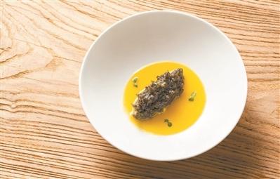 “腰果南瓜汁烩素参”上桌时,令人惊叹其形态的逼真。这素参是以海藻制成,质地Q弹,此菜肴的创新之处在于厨师将南瓜与腰果精心研磨成细腻浓浆,与海藻素参巧妙烩制,实现了风味的深度交融与提升,赋予了菜品甜润不腻、层次分明的口感。