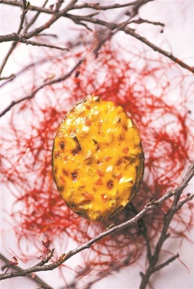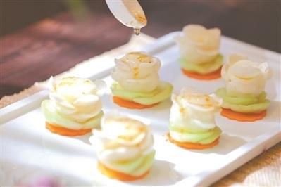 天妇罗火龙果、百香果石榴球都是以水果入馔的菜式。天妇罗是日式烹调法,将火龙果裹上天妇罗面糊,精准控温油炸,让火龙果的自然风味与天妇罗的香脆口感完美结合。风味上,这道菜甜中带脆,层次丰富,既有火龙果的清甜,又有天妇罗的香酥。而百香果石榴球的特色在于将热带水果百香果和红火龙果结合,二者口感互补,创造出独特的风味,甜中带酸,清新解腻。