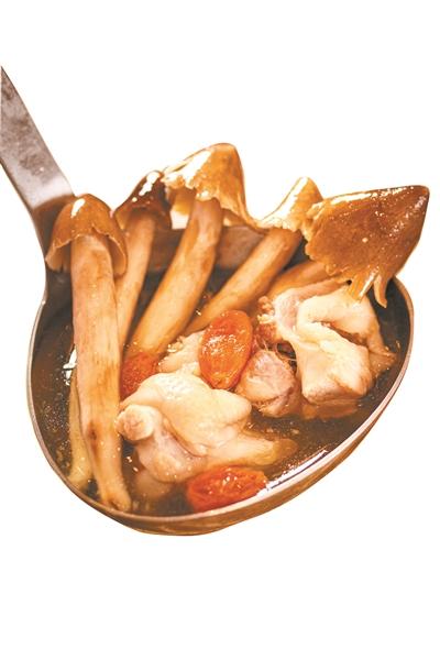 岭南荔枝菌与清远名鸡的邂逅,山海相逢,最是精妙。琥珀色的菌汤,澄澈见底,温润如玉,将去皮的滑嫩鸡肉缓缓浸没,文火慢煨中,鸡脂的丰腴醇香与菌子特有的山野清鲜,在汤水中悄然融合。御口福的荔枝菌浸清远鸡精华在于汤,汤清而滋味醇厚深邃,至鲜至醇。口感上最合拍的,得数荔枝菌蒸鲍鱼。鲍鱼的丰腴弹牙,菌子的脆嫩鲜甜,层次分明又浑然一体,一口便能同时体验海味的浓郁和荔枝菌的鲜嫩。
