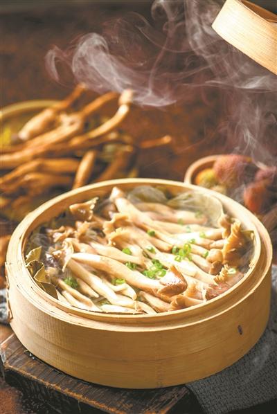 新鲜荔枝菌质如白玉凝脂,用翠绿荷叶作笼。蒸汽升腾间,菌子的鲜被牢牢锁住,荷叶香气扑鼻。箸尖轻触,菌体脆嫩,鲜甜的汁水在齿间瞬间迸发,纯粹而奔放的滋味,一股沁人心脾的清爽直抵喉头。