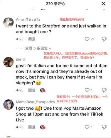 当然,也有“体力不佳”的用户选择“技术流”路线。昵称为“MamaBear”的美国粉丝就没去排队,而是蹲守在泡泡玛特的TikTok Shop直播间,靠手速抢下了一只Labubu。
