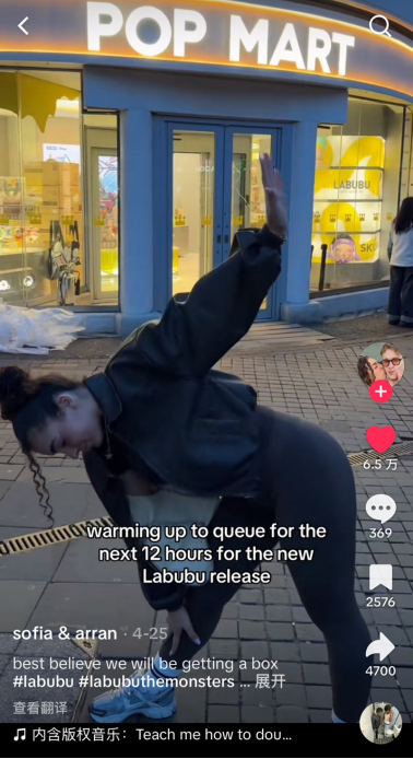 就在不久前,泡泡玛特宣布在全球发售Labubu的最新系列“前方高能”。“为了抢到这一波Labubu,我们提前12小时开始热身。”Sofia将这一幕拍成视频发布在TikTok上,短时间内冲上热门,吸引超过70万人观看,评论区被“这才是真爱粉”“求开箱”“凌晨排队的我还有希望吗”等留言刷屏。