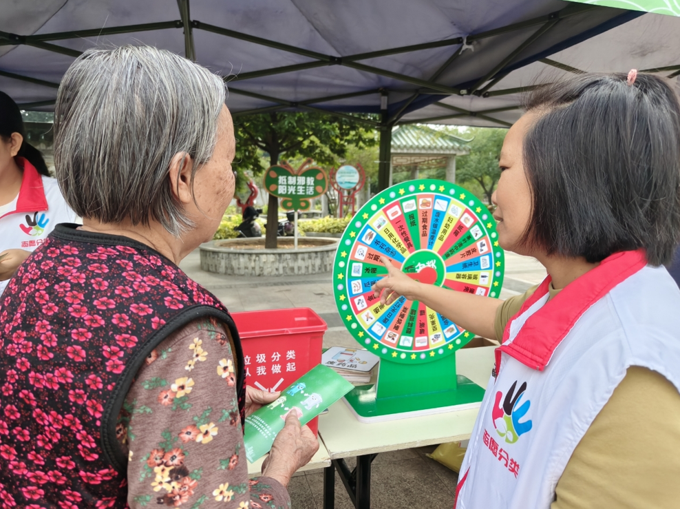 活动现场早早便热闹起来,身穿红马甲的督导员与志愿者们摆好宣传展台,《广州市南沙区生活垃圾分类指南》在桌上整齐码放,吸引着路过村民的目光。“阿叔,这份指南里写清了厨余垃圾和其他垃圾的区分,您拿回去看看!”志愿者们热情地向村民派发宣传资料,针对大家提出的“大骨头该归哪类”“废旧灯管怎么投”等问题,督导员们用方言和通俗的例子逐一解答,将专业的分类知识转化为易懂的生活常识。