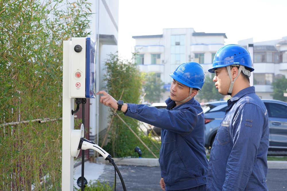 南方电网广东韶关仁化供电局运维人员对充电桩进行巡检工作(陈怡霖 摄)