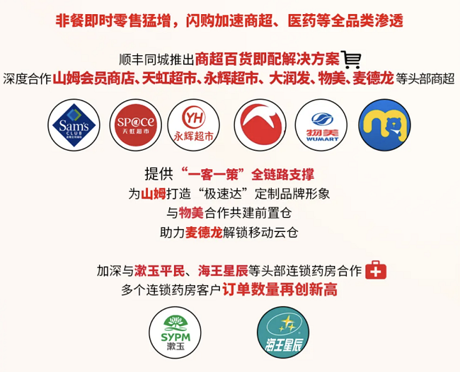 发力自建私域渠道的还有各类连锁商超、社区便利店,以及前置仓等新型零售终端。顺丰同城与山姆会员商店、天虹超市、永辉超市、大润发、物美、麦德龙等头部商超达成深度合作,以中立第三方定位接入多平台,覆盖公域、私域全渠道,包括为山姆会员商店打造“极速达”定制品牌形象,与物美在前置仓模式上深入合作,同麦德龙合作解锁移动云仓场景等。