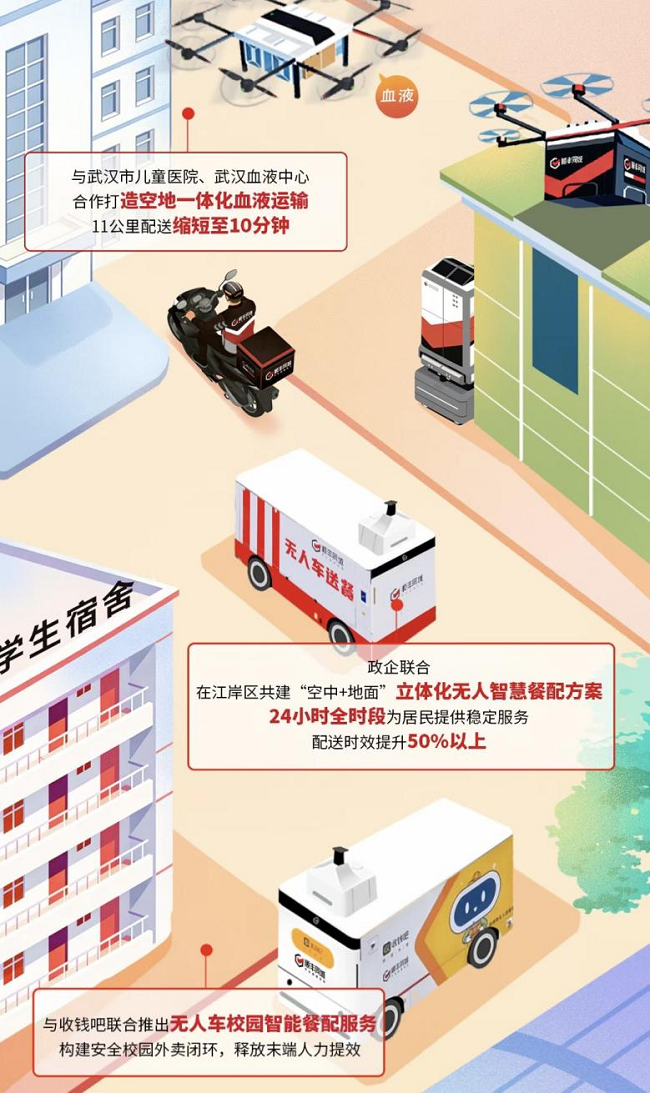 随着无人车能力升级,顺丰同城“二轮+四轮+无人配送”多元运力体系日趋完善,不断探索智慧物流的新场景:与肯德基、收钱吧等联合推出无人车智慧配送服务,提高不同场景接驳的灵活性;携手武汉市儿童医院、武汉血液中心合作打造空地一体化血液运输,为医疗应急场景提供配送保障;与武汉江岸区政府、百胜餐饮合作,打造“空中+地面”立体化无人智慧餐配方案,满足用户在交通不便地区、夜间或高峰时段以及恶劣天气等场景下对餐配服务的需求。在人机协同提效下,顺丰同城正在加速构建更智能、更弹性、更高韧性的下一代即时配送网。