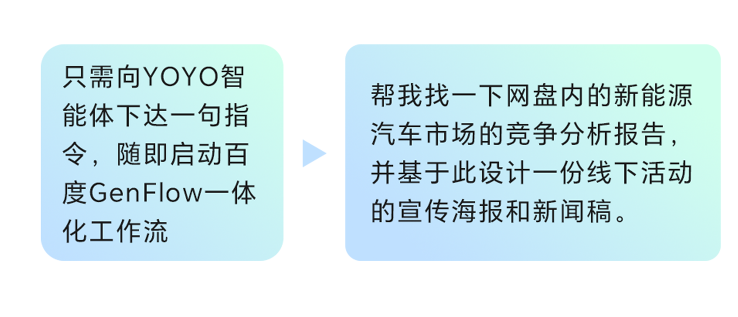 例如用户想洞察某行业的市场竞争格局,只需向YOYO智能体下达指令,授权后便会启动百度GenFlow一体化工作流,自动检索百度文库、用户授权后的个人网盘等资源并智能整合,将散落在百度文库、网盘各处的信息碎片,自动整理归纳,将用户从“资料搬运工” 中彻底解放。