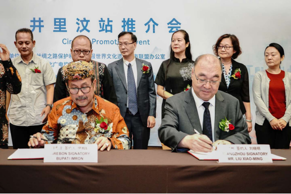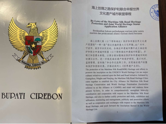 2024年11月14日,中国长沙。井里汶郡政府代表与34座中国海丝遗产城市代表,联合签署联盟新章程文本,正式加入海丝申遗城市联盟