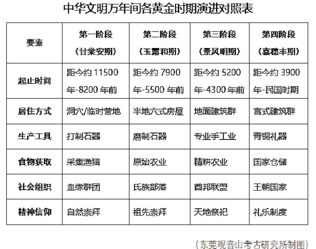 史前大洪水在全球的不同文明中都有记载,是人类共同的记忆,至于具体描述是哪一次大洪水,有待今后的进一步研究。以四次大洪水为界标,可将万年中华文明史划分为四大阶段,既能界定考古和历史分段时间与文明程度的界线,又能将全球文明演变纳入统一时空框架。这一设想由东莞观音山对外完整提出,争取推动考古与历史研究从感性认知跃升至理性建构的新高度。它不仅厘清了万年文化史演变的底层逻辑,更搭建起一套行之有效的科学方法,为今后的考古与历史研究提供了中国的优选方案,并可借助此时空框架,将考古和历史学的研究提升到全新高度,为改写全球万年文化史及断代史提供全新视角和经纬坐标。中华区域内万年来从初级到高级的文明发展要素,可对应归入1—4阶段进行比较。这种方式简单明了、科学高效,便于检索完善,更有助于系统化梳理考古材料、深化文明演进规律的研究,并为构建连贯严谨的历史叙述体系提供清晰的时空框架和全景的视野。
